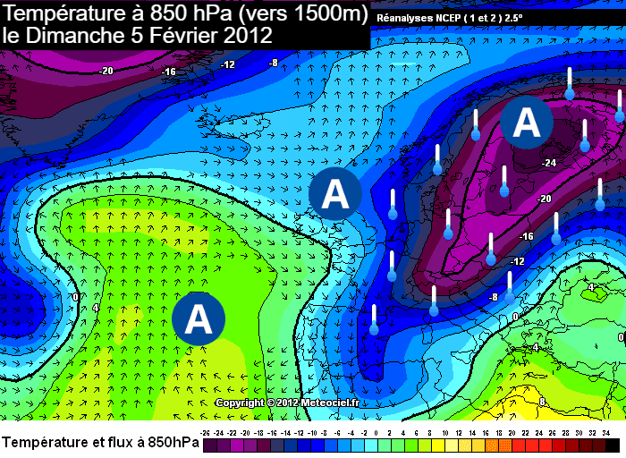 Masse d'air à 850 hPa (vers 1500m) le dimanche 5 février 2012 - meteociel.fr