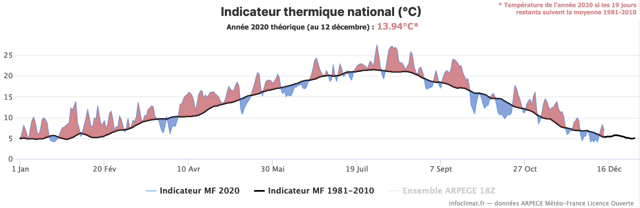 A la date du 12 décembre inclus, et en considérant que les 19 jours restants soient parfaitement dans les normes de saison, la température moyenne théorique de 2020 s’élèverait en France à 13.94°C. Pour rappel, l'année 2018, record en date, voyait une température finale de ... 13.94°C !