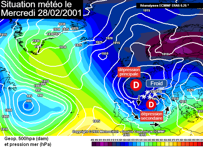Fin février 2001, la France subit sa première véritable offensive hivernale depuis novembre 1999 ! Une dépression circule sur le bassin parisien et advecte de l'air froid sur le pays. Dans le même temps, un minimum dépressionnaire secondaire se creuse dans le golfe de Gênes, ce qui entraîne un retour d'est responsable de fortes précipitations persistantes sur le nord de l'Italie et le sud-est de la France. L'isothermie se met en place et il se met à neiger en plaine sur la Provence, particulièrement durant la nuit du 27 au 28 février 2001.
