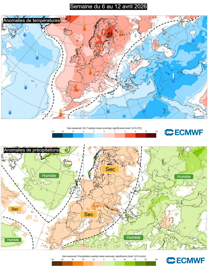 Anomalies de précipitations et de températures sur l'Europe pour la semaine du 6 au 12 avril 2026 – ECMWF