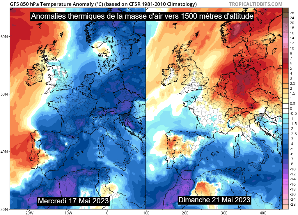 Anomalies thermiques de la masse d'air les mercredi 17 et dimanche 21 mai 2023 - via tropicaltidbits.com