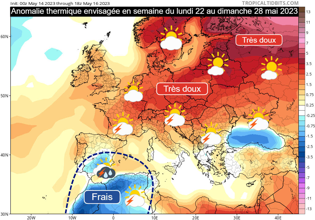 La semaine prochaine - du 22 au 28 mai 2023 - devrait nous apporter des températures bien plus clémentes que l'actuelle. Nous devrions ainsi renouer avec des valeurs dignes de la saison voire quelque peu excédentaires, notamment en se dirigeant vers le nord-est de la France. Il sera toutefois plus question de douceur que de chaleur. En effet, le nord-ouest du continent africain et le sud de la péninsule ibérique devraient rester concernés par une anomalie fraîche et instable. Or, c'est de ces régions que nous proviennent la plupart des offensives de chaleur. Nous devrions donc rester à l'abri des températures excessives d'ici à la fin du mois.