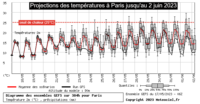 Projections des températures à Paris du 17 mai au 2 juin 2023 - via meteociel.fr