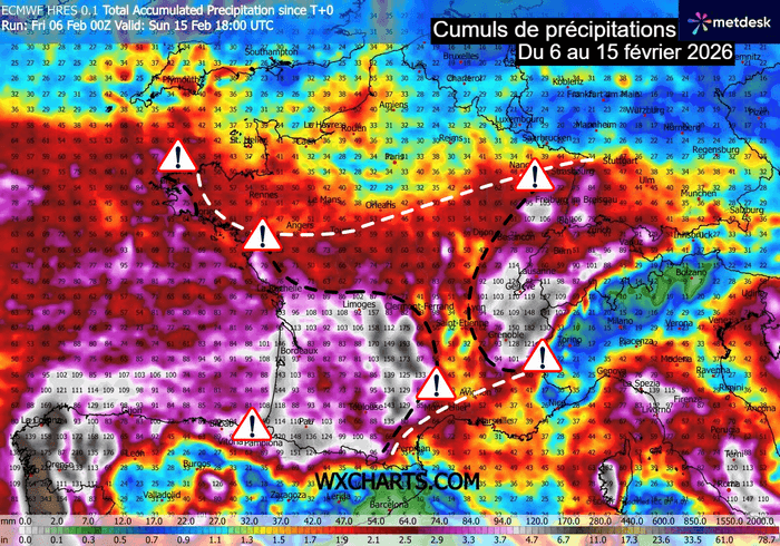 Cumuls de précipitations attendus du 6 au 15 février 2026 – Modèle ECMWF via WX CHARTS