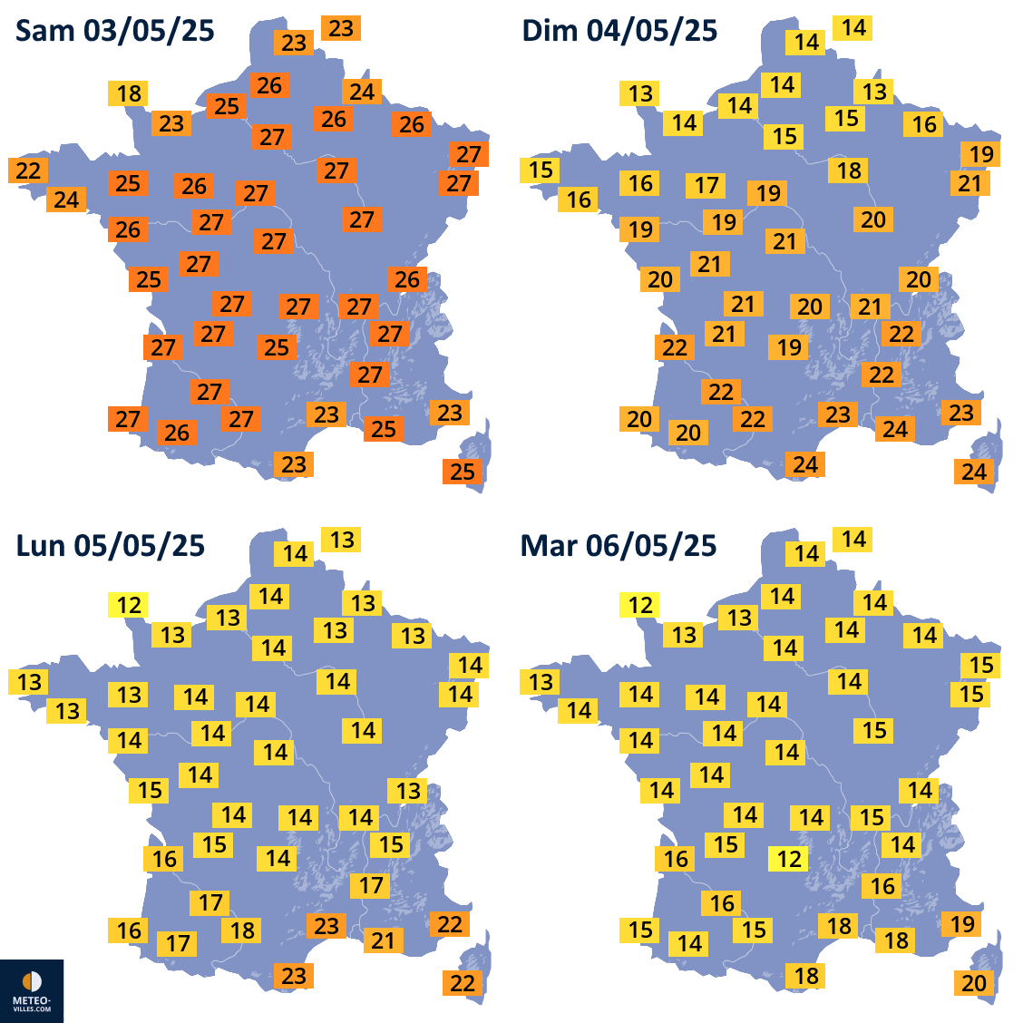 Températures maximales prévues du samedi 3 au mardi 6 mai 2025 - Météo Villes