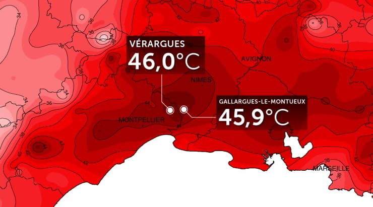 Alors qu'en cet été 2022 ont été mesurés les premiers 40°C dans le département du Finistère et qu'il a fait 42°C à Nantes, l'été 2019 détient de nombreux records absolus tels que 41,5°C à Lille ou 42,6°C à Paris. Les valeurs les plus extrêmes avaient été mesurées fin juin dans le Languedoc. Le juin 2019, la barre des 45°C fut dépassée avec 45,9°C à Gallargues-le-Montueux (Gard) et 46,0°C à Vérargues (Hérault), du jamais vu en France ! Si les projections annonçant de possibles 50°C en France avant la fin du siècle paraissaient étonnantes avant ces records, elles ne le sont plus vraiment aujourd'hui...