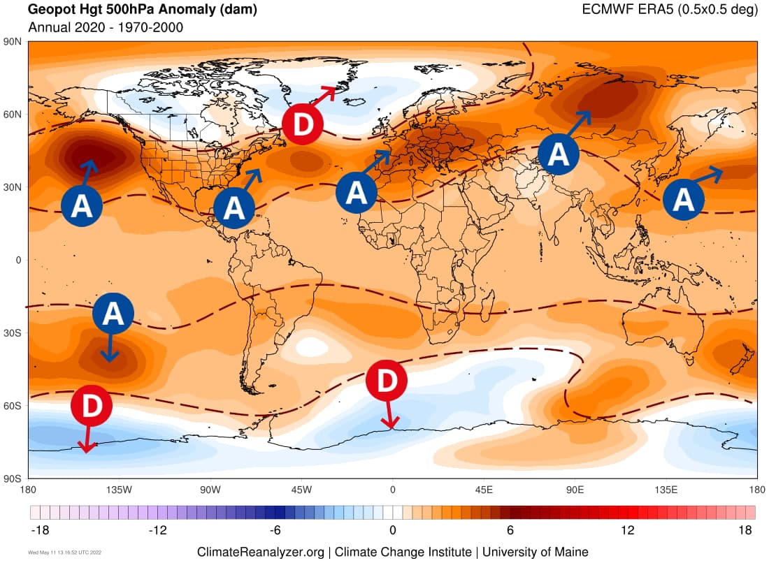 Anomalie de géopotentiels dans le monde au cours de l'année 2020 - via climatereanalyzer.org