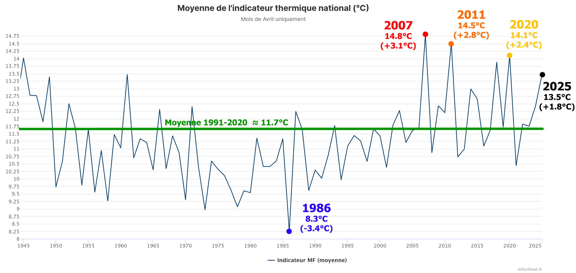 Indicateur thermique national pour avril 2025 depuis l'après-guerre (1945) - Infoclimat