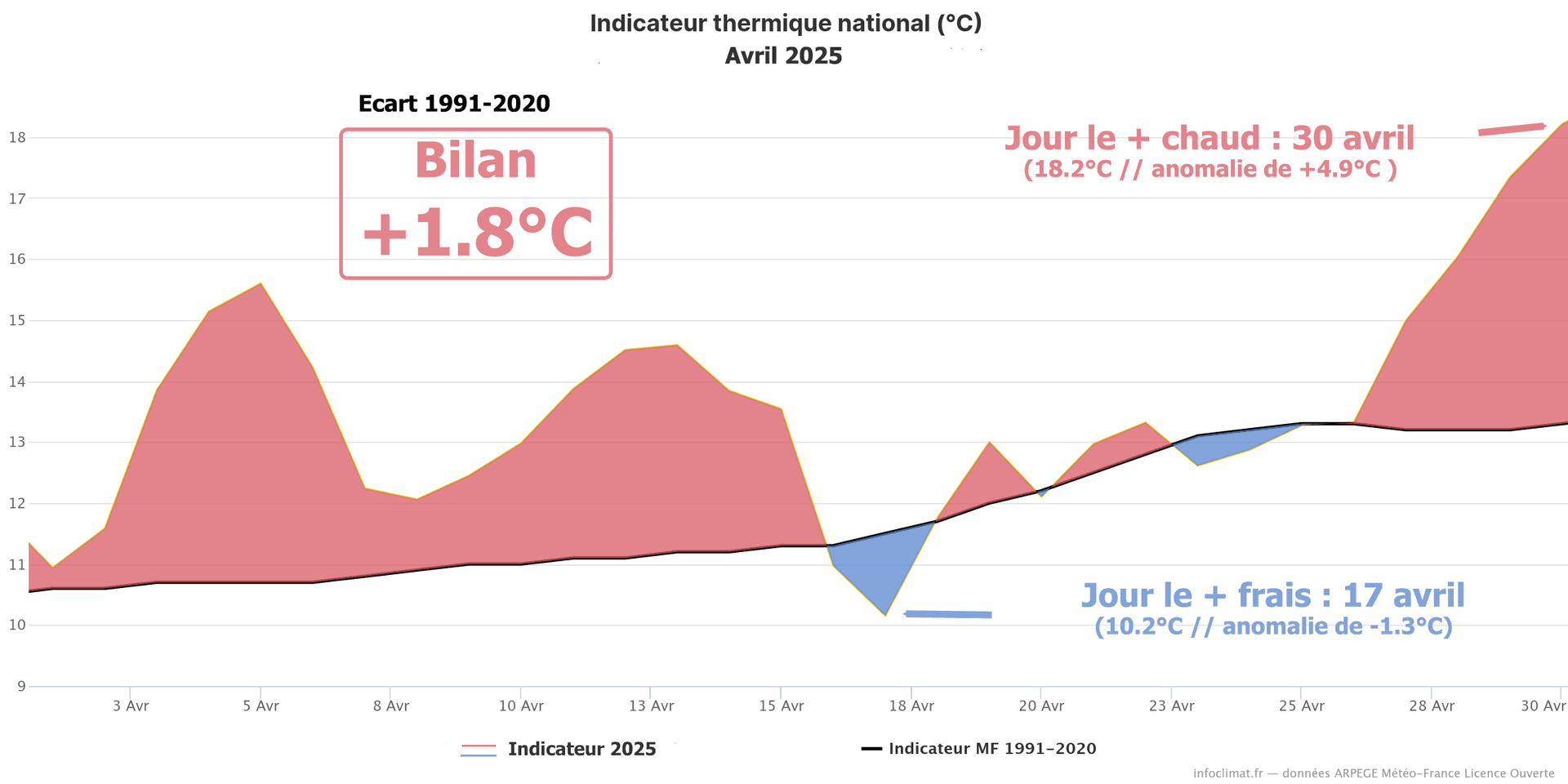 Avec un indicateur thermique d'environ 13.5°C, avril 2025 a été dans l’ensemble très doux sur la France, avec une anomalie atteignant +1.8°C à l’échelle nationale (par rapport à la moyenne 1991-2020).