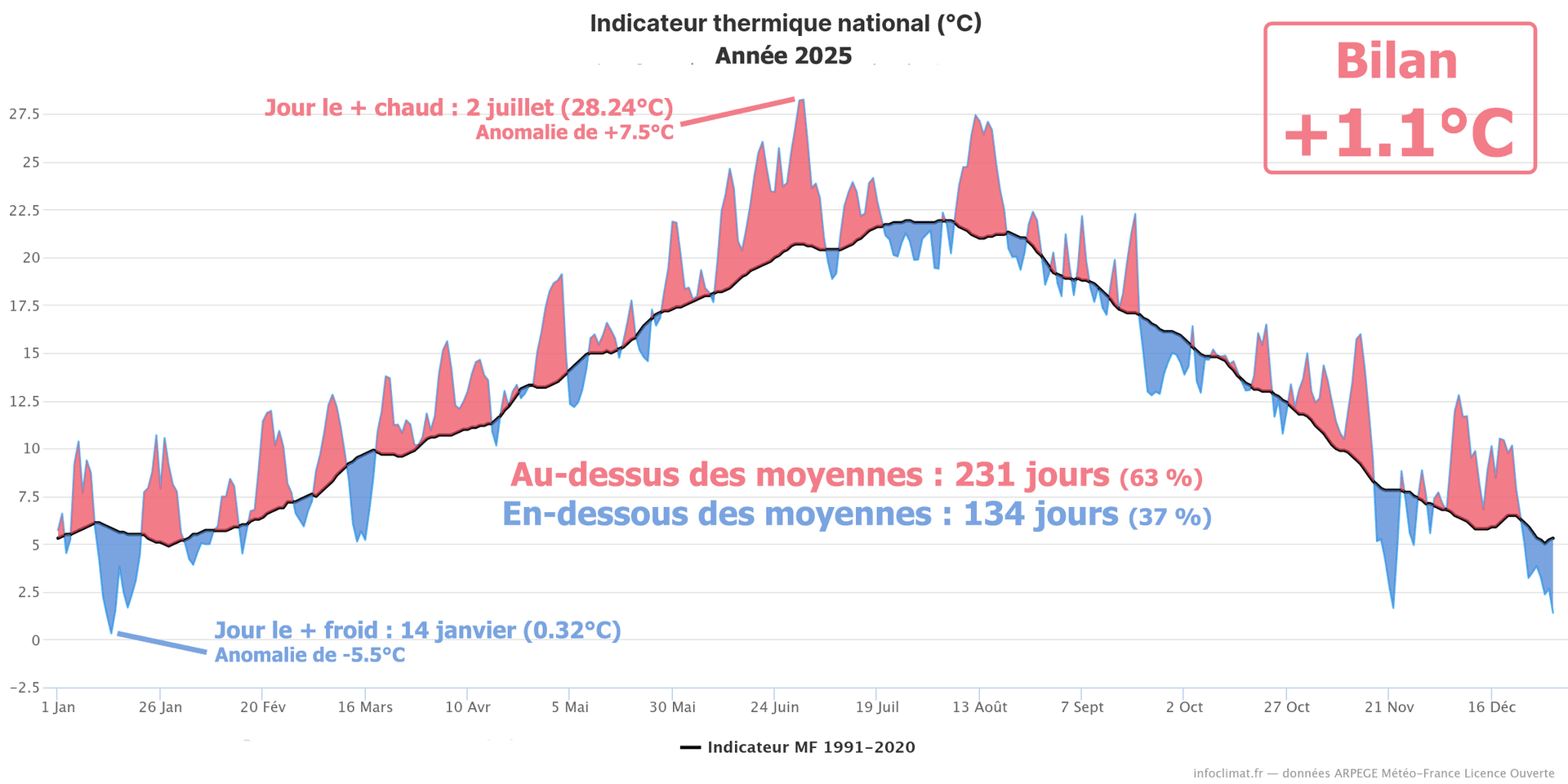 Une nouvelle fois bien au-delà des moyennes ! Avec un indicateur thermique national de 14.03°C pour 2025, nous venons de vivre en France la 4e année la plus chaude depuis le début des mesures météorologiques, à quasi-égalité avec la 3e place détenue par l'année 2020 (14.07°C). Nous nous situons exactement à +1.06°C au-dessus de la moyenne de référence de la période 1991-2020 (qui s'établit à 12.97°C).