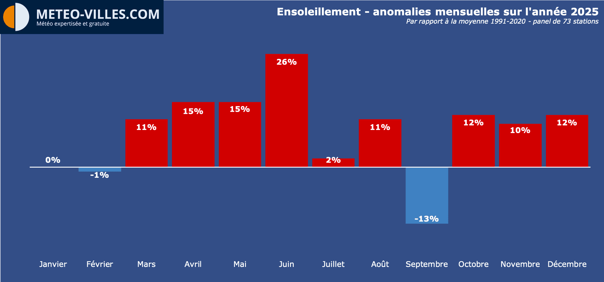 Toute l'équipe de Météo-Villes vous souhaite une très bonne année 2026 ! Et pour débuter cette nouvelle année, il est l'heure de faire les comptes de l'année écoulée. Place donc au bilan météorologique et climatique complet de cette ANNÉE 2025 en termes de température, pluviométrie et ensoleillement sur un panel de 73 stations, (par rapport à la moyenne climatique de référence 1991-2020)*.