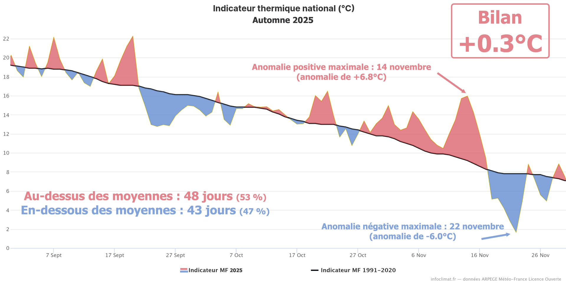 Évolution des températures quotidiennes en France durant l'automne météorologique 2025 et écart à la moyenne 1991-2020 - Infoclimat