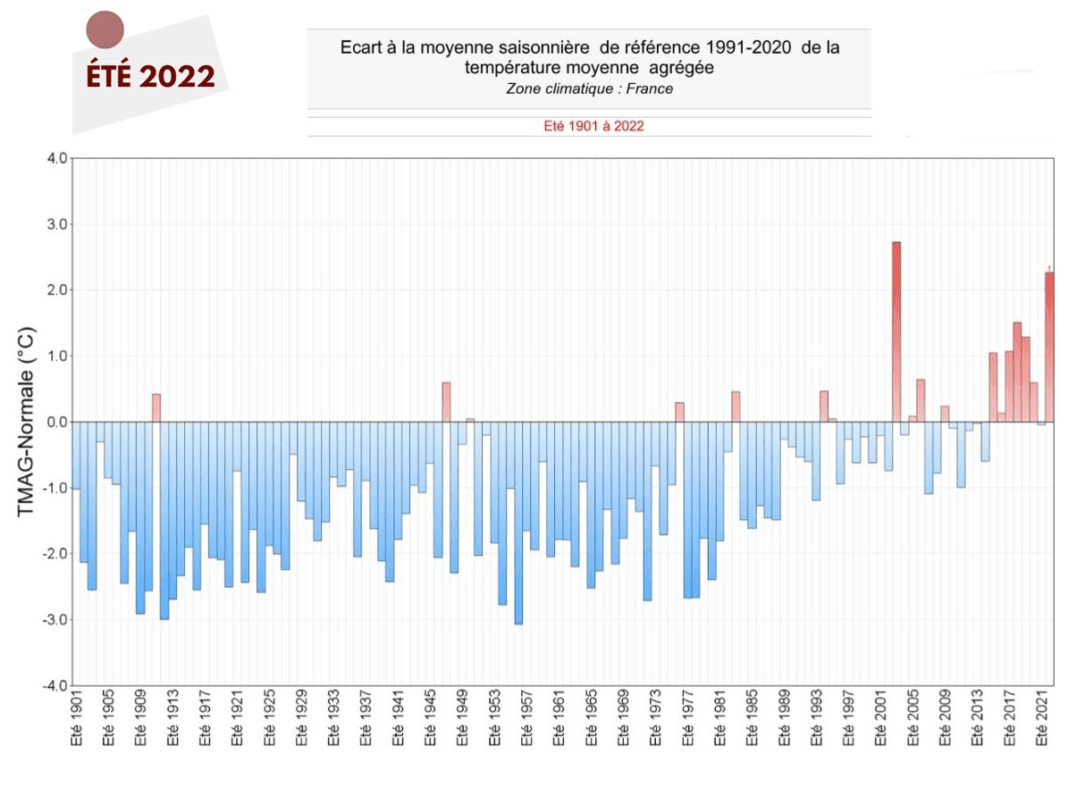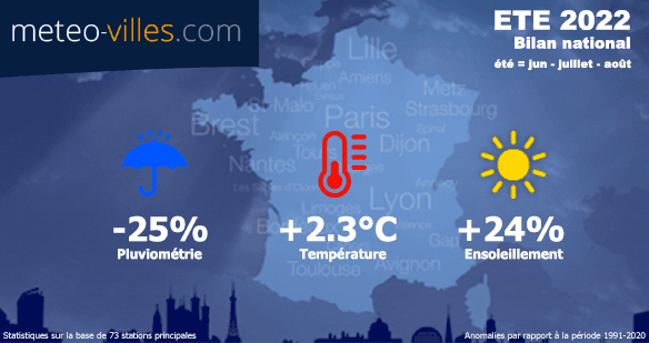 Avec un indicateur thermique national de 22.69°C (moyenne de 30 stations), cet été 2022 se termine avec une anomalie de +2.3°C, se positionnant donc comme le 2e été le plus chaud depuis 1900, juste derrière l'historique été 2003 (+2.7°C, indicateur de 23.18°C). Le podium est ensuite complété par l'été 2018 (+1.5°C, indicateur de 21.96°C).