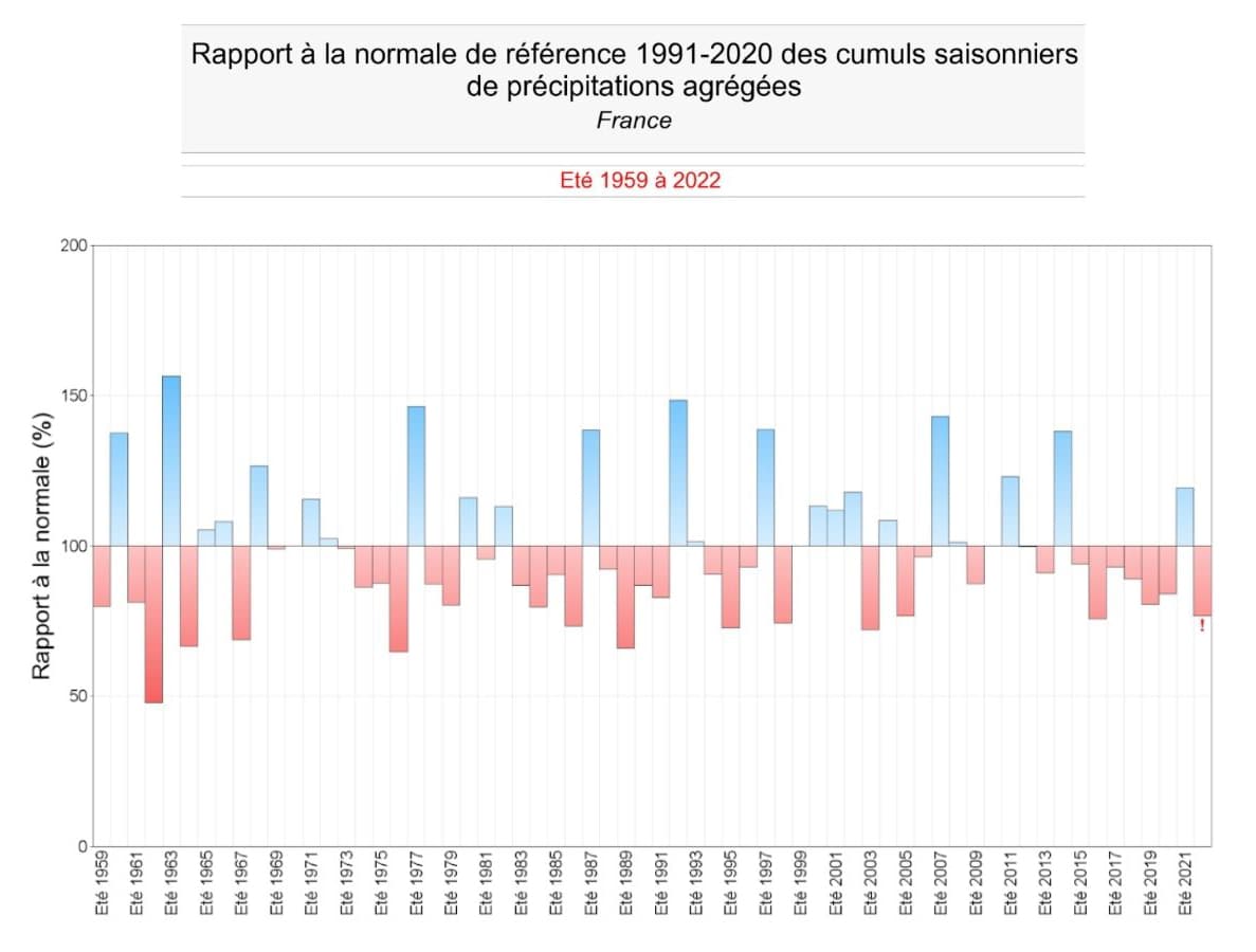 Outre le caractère exceptionnellement chaud de cet été 2022, l'autre fait aggravant a été celui d'une absence notable de pluie. Avec un déficit pluviométrique de -25% à l'échelle national,  il s'agit d'un été entrant au niveau du 10e rang des plus secs depuis le début de la série statistique en 1959, et le plus sec observé depuis 2016.