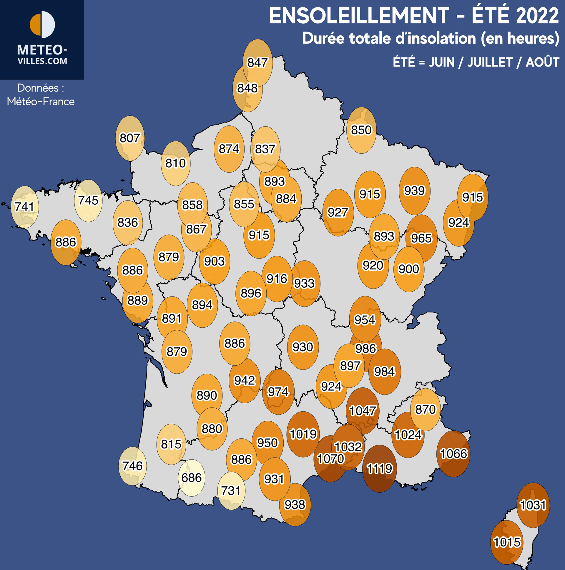 Les trois mois de cet été ont vu un excédent, avec un impressionnant mois de juillet (records d'ensoleillement). Voici le récapitulatif d'ensoleillement des trois mois de l'été météo 2022 :