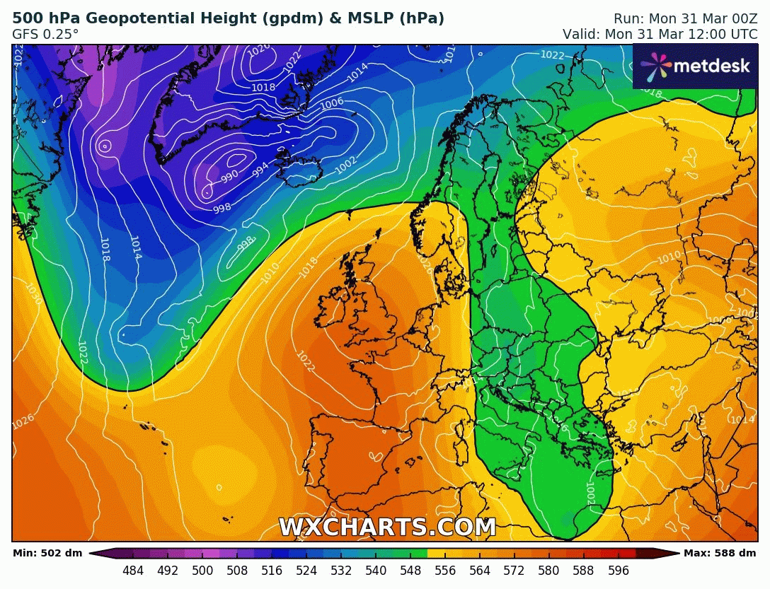 Animation des géopotentiels sur l'Europe du 31 mars au 7 avril 2025 – Modèle GFS via WX CHARTS