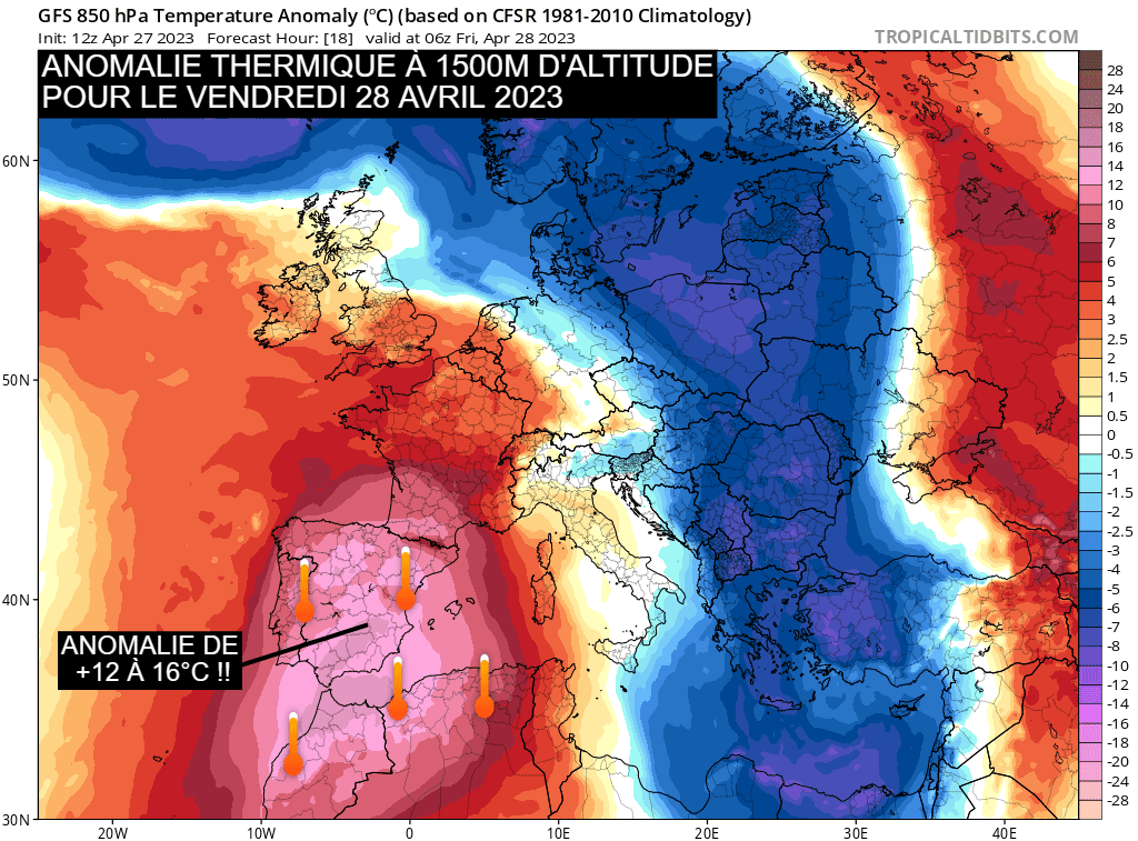 C'est une dorsale positionnée sur la péninsule ibérique qui est à l'origine de l'advection d'air bouillant en provenance d'Afrique sur l'Espagne. Ces jeudi 27 et vendredi 28 avril 2023, les températures atteignent 20 à 24°C à 850 hPa, soit vers 1500 mètres d’altitude. De telles températures de la masse d’air sont semblables à celles que l’on rencontre lors des canicules estivales et n'avaient encore jamais été observées en avril ! L'écart à la normale de ces valeurs est de +12 à +16°C comme le montre la carte ci-dessous, une anomalie spectaculaire !