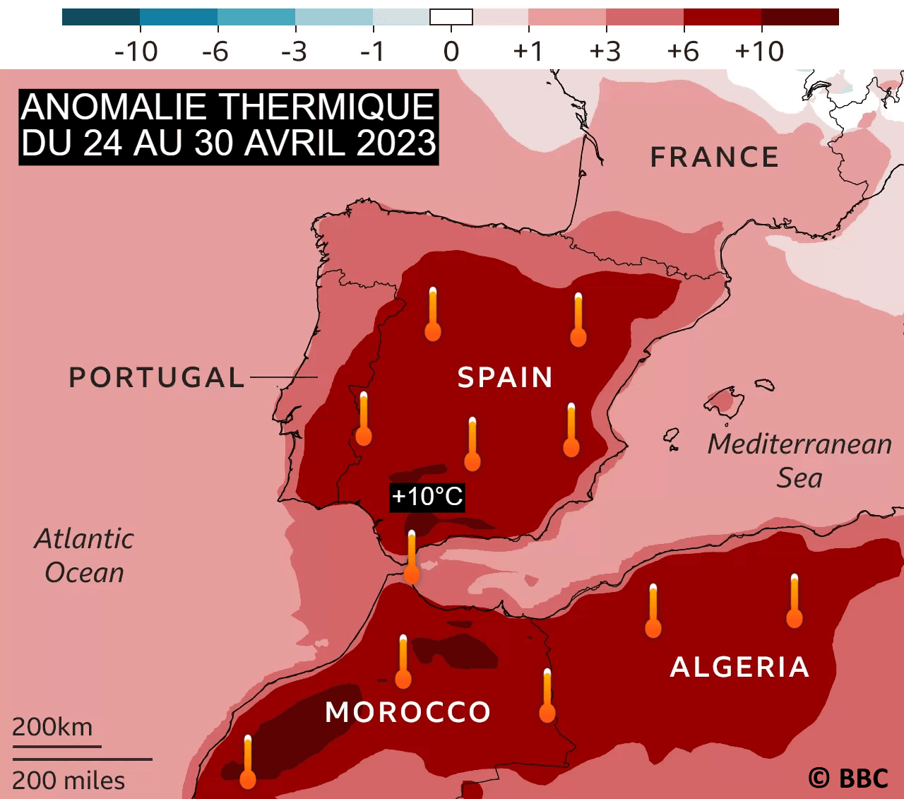 Ainsi, la péninsule ibérique subit une vague de chaleur d'ampleur inédite en cette dernière semaine du mois. Sur la période allant du 24 au 30 avril 2023, l'excédent thermique moyen s'établit entre +6 et +10°C sur une grande partie de l'Espagne ! Des pointes à +10°C sont atteintes dans le sud du pays, notamment en Andalousie. Une anomalie de +10°C sur 7 jours est tout bonnement spectaculaire ! Notons que le nord-ouest du Maghreb subit des anomalies tout aussi exceptionnelles avec une masse d'air en provenance du Sahara !