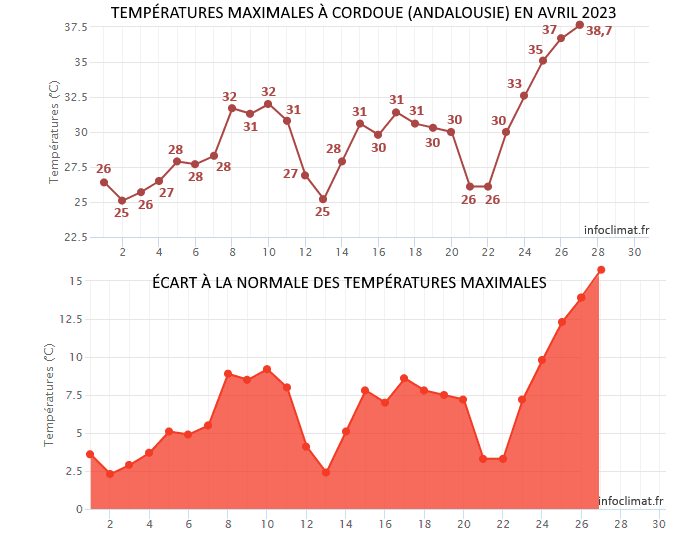 Températures maximales et écart à la normale à Cordoue du 1er au 27 avril 2023 - via infoclimat.fr
