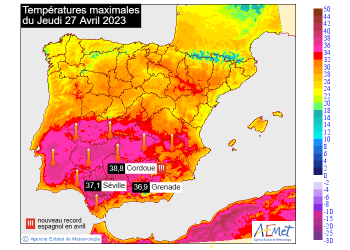 C'est toutefois la station de l'aéroport de Cordoue qui a enregistré la valeur la plus haute de la journée. On y a mesuré 38,8°C ce jeudi 27 avril 2023, pulvérisant de 4,7°C l'ancien record d'avril 1997 (34,0°C) ! Il s'agit d'ailleurs d'un nouveau record de chaleur pour l'ensemble de l'Espagne en avril, battant les 38,6°C d'Elche en avril 2011 ! Par la même occasion, cette valeur de 38,8°C est devenue le nouveau record de chaleur en avril pour le continent européen !