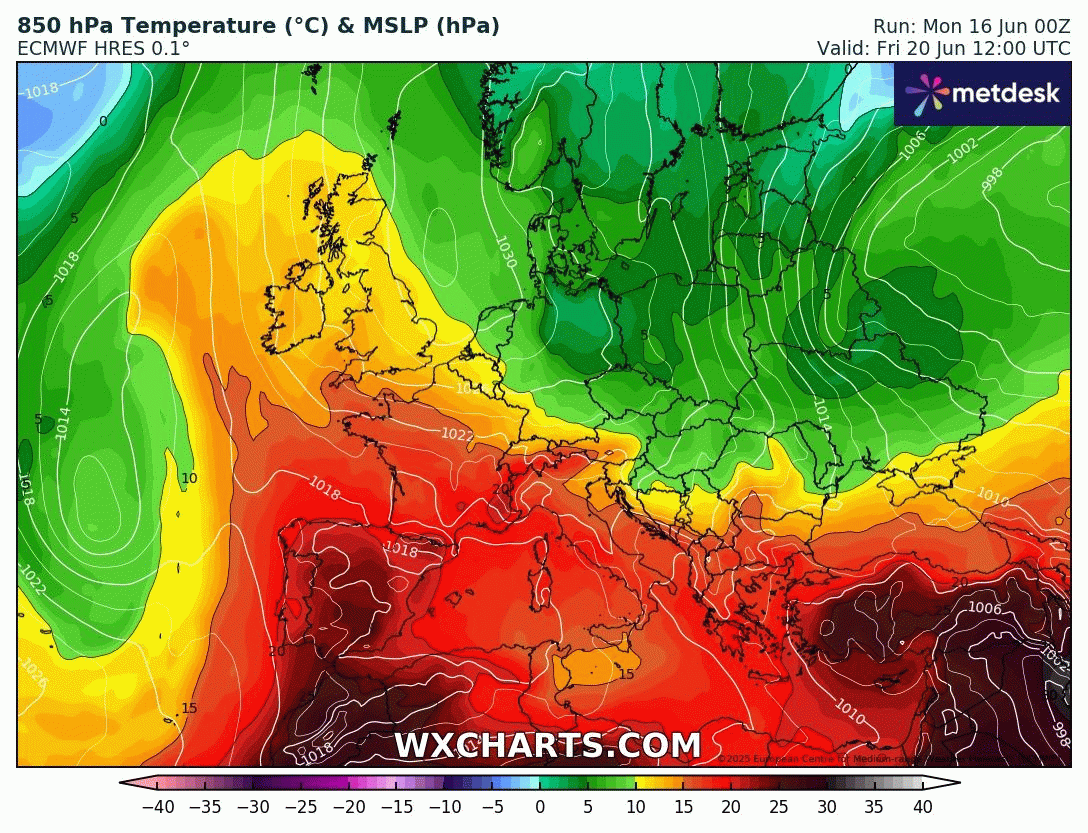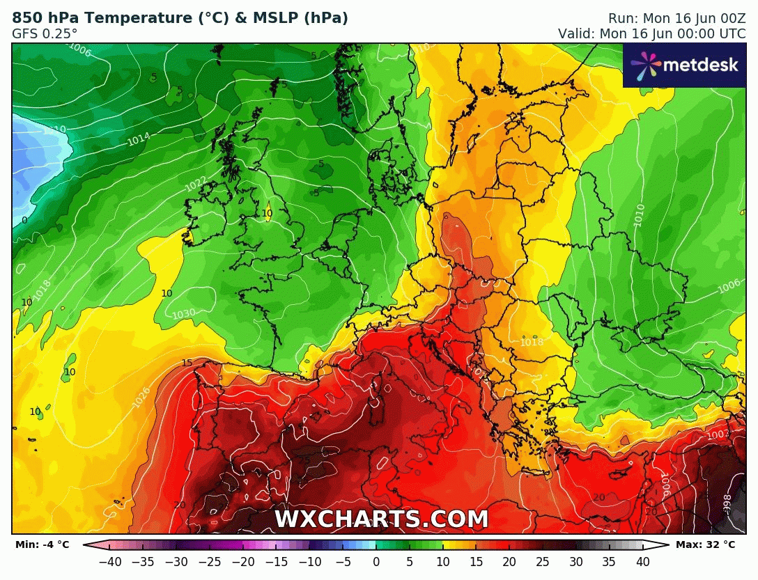 Animation des températures à 850 hPa sur l'Europe du 16 au 22 juin 2025 – Modèle GFS via WX CHARTS