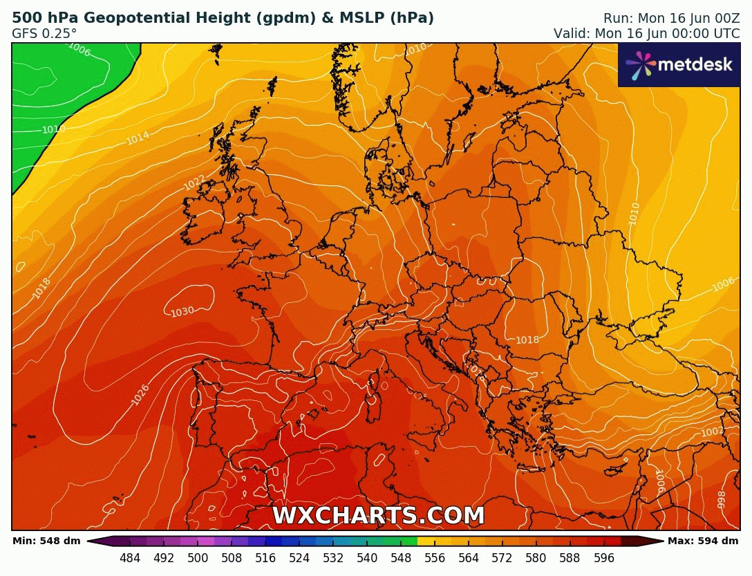 Animation des géopotentiels sur l'Europe du 16 au 22 juin 2025 – Modèle GFS via WX CHARTS