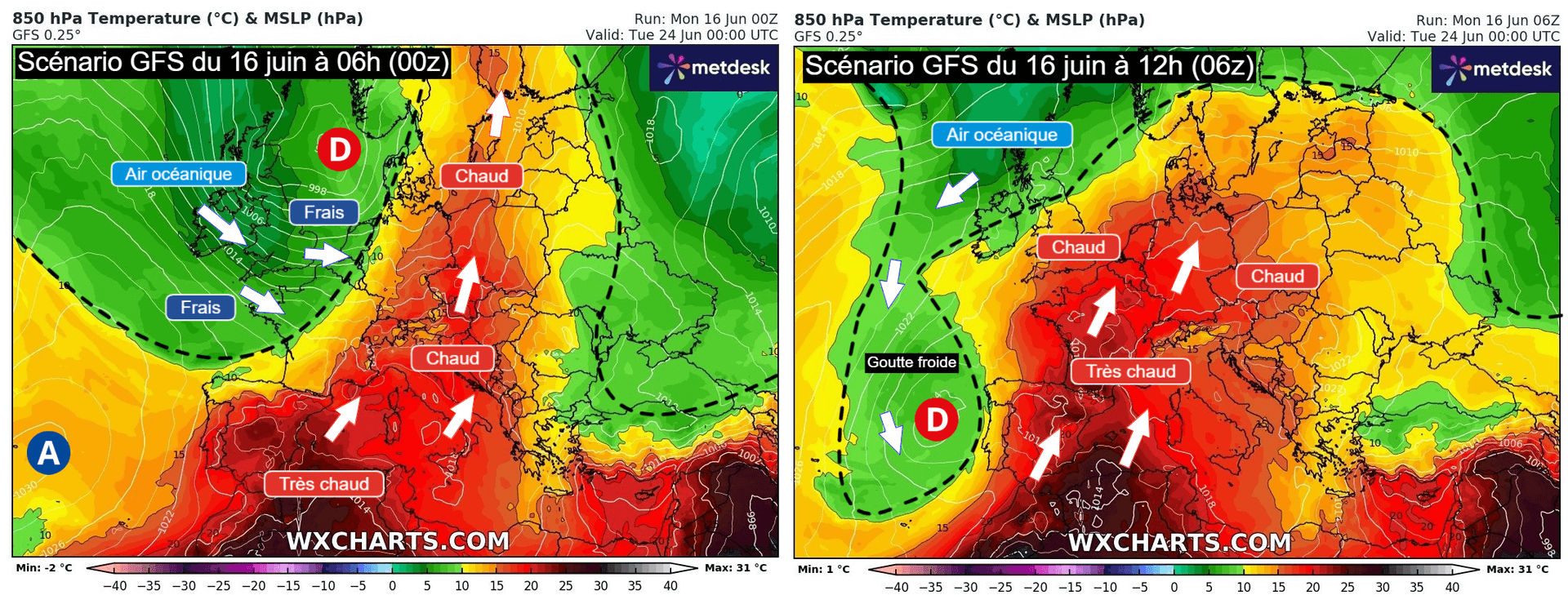 Néanmoins, ce même modèle est très indécis dans ses dernières réactualisations, oscillant entre scénarios instables et "rafraîchis" pour le début de semaine suivante et scénarios bien plus chauds et caniculaires pour le début de semaine prochaine.