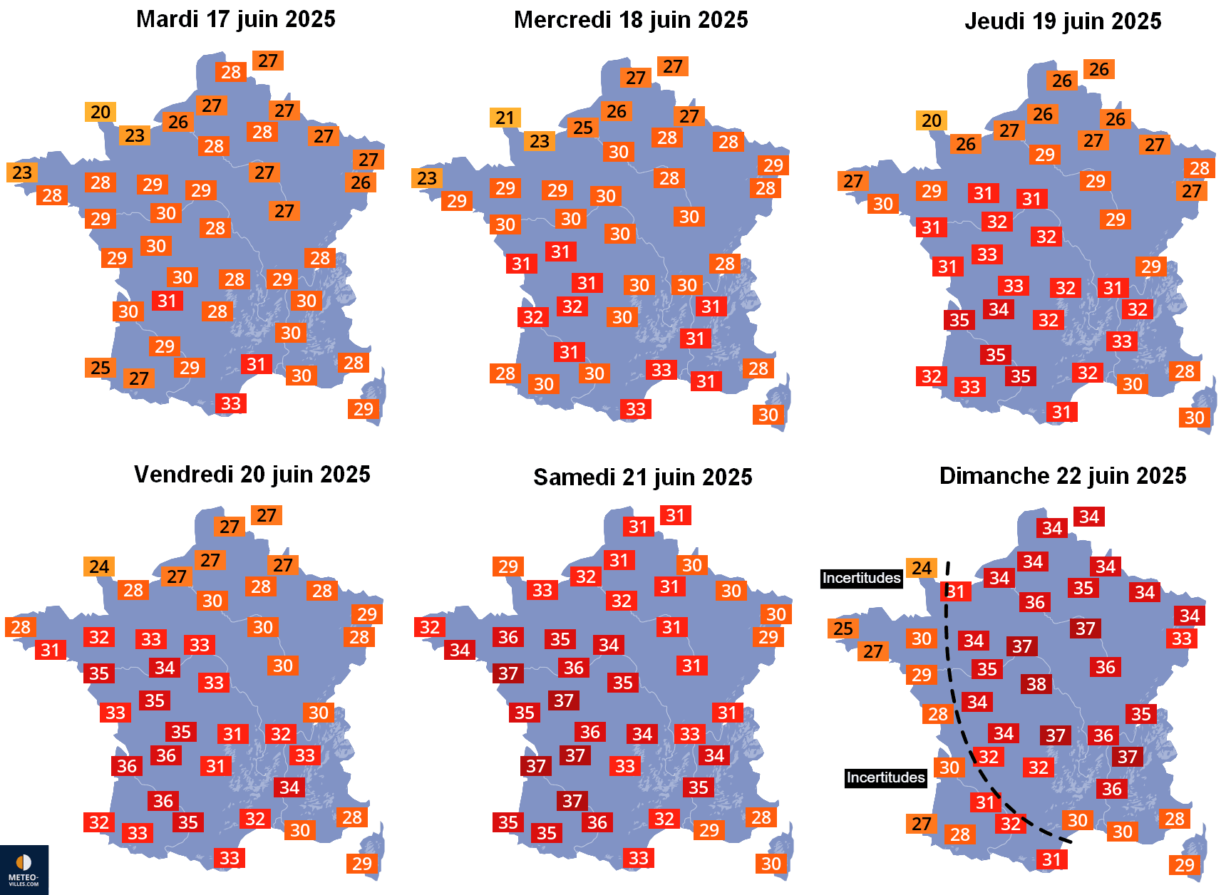 Évolution des températures maximales sur la France du 17 au 22 juin 2025 – Météo-Villes