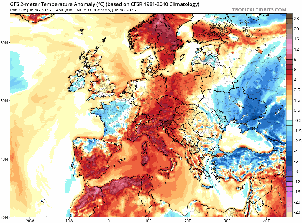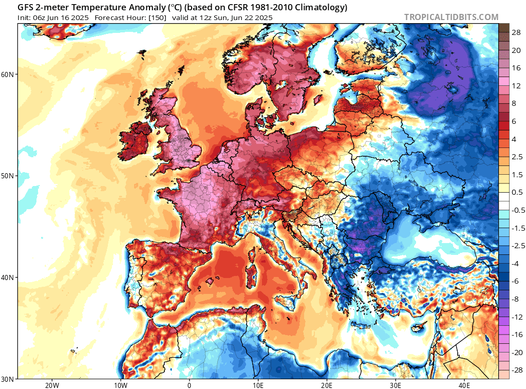 Animation des anomalies de températures à 2m sur l'Europe du 16 au 22 juin 2025 – Via TropicalTidBits
