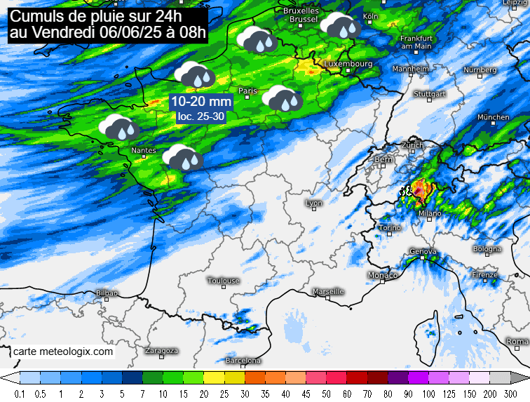 Cumuls de pluie sur 24h au vendredi 6 juin 2025 à 08h - carte meteologix.com