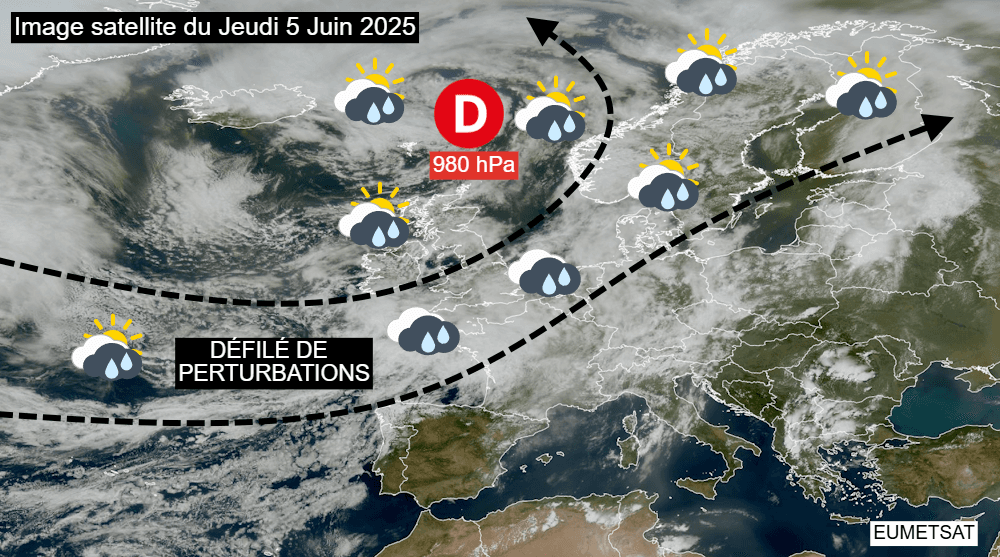 Ainsi, un flux océanique dynamique concerne une bonne partie de l'Europe. Comme le montre l'image satellite ci-dessous, plusieurs perturbations s'enchaînent de l'Atlantique jusqu'à la Scandinavie ce jeudi 5 juin 2025, sous l'influence de ce courant jet et d'une dépression centrée à près de 980 hPa en Mer de Norvège. Cette configuration s'apparente à une circulation atmosphérique typique de l'automne ou de l'hiver. Elle est en revanche assez peu commune en juin, bien qu'absolument pas inédite.