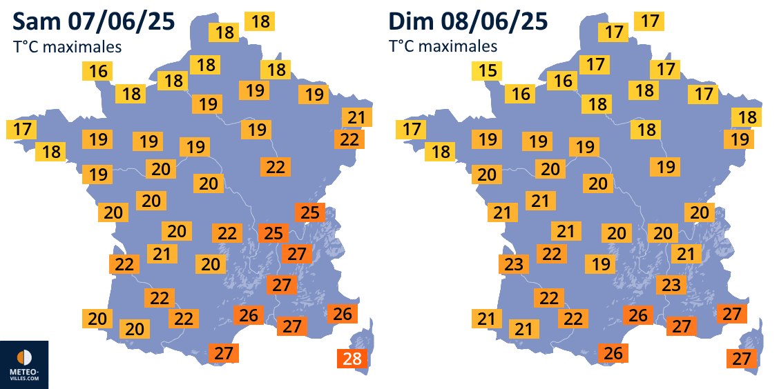 Températures maximales prévues les samedi 7 et dimanche 8 juin 2025 - Météo Villes