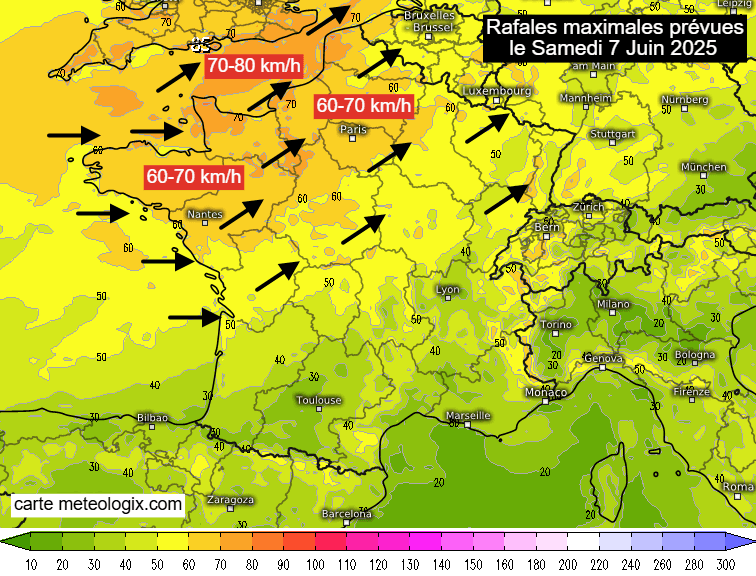 Rafales de vent maximales prévues le samedi 7 juin 2025 - carte meteologix.com
