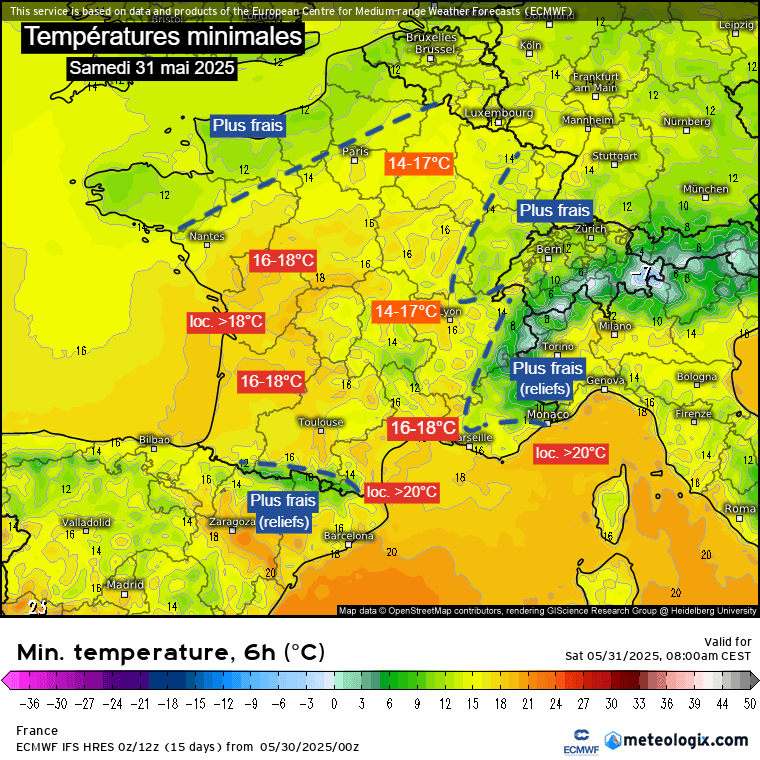 Températures minimales attendues sur la France pour la nuit du 30 au 31 mai 2025 – Modèle ECMWF HRES via Meteologix