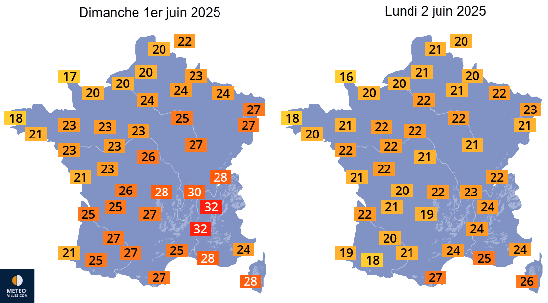 Températures maximales envisagées pour le 1er et le 2 juin 2025 sur la France – Météo-Villes