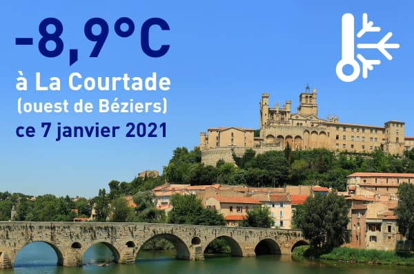 Ce matin du 7 janvier 2021, on a relevé -8,9°C à La Courtade sur l'ouest de Béziers dans l'Hérault ! Sur cette commune, il avait déjà fait -8,2°C la veille. Dans le Gard, on a mesuré -8,6°C à Vic-le-Fesq ce matin tandis que le thermomètre est descendu jusqu'à -7,5°C à Apt dans le Vaucluse. Dans le département des Bouches-du-Rhône, il faisait -6,1°C à l'aube à Salon-de-Provence. Notons aussi qu'il a fait -12,6°C à Sisteron à seulement 500 mètres d'altitude dans les Alpes-de-Haute-Provence !