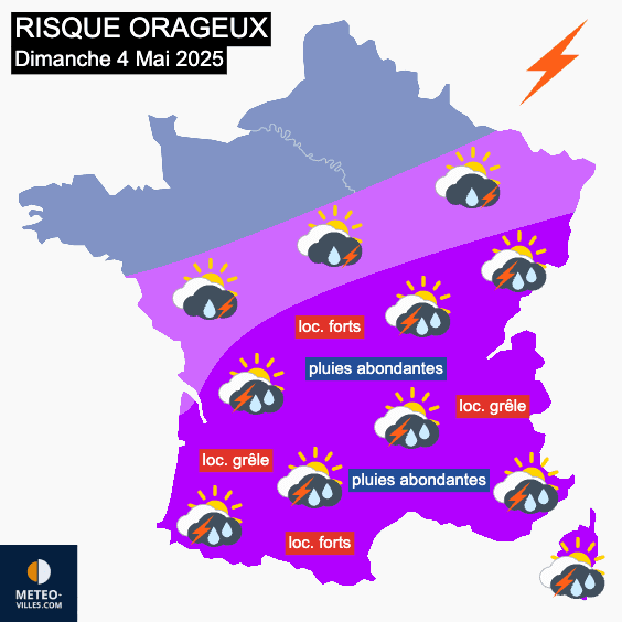 Carte du risque orageux pour le dimanche 4 mai 2025 - Météo Villes