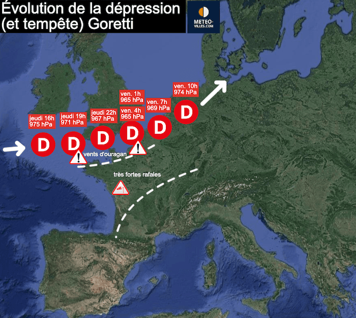 Le conflit de masse d’air va entraîner le développement rapide d’une dépression nommée Goretti.  Cette dernière sera propulsée à grande vitesse par ce puissant courant d'altitude entre le sud de l’Irlande et le sud de l’Angleterre jeudi après-midi et soirée.  Son intensité maximale sera atteinte en arrivant sur les Flandres françaises et belges dans la nuit de vendredi, avec une pression barométrique estimée à 965-970 hPa et un gradient de pression très resserré le long des côtes de la Manche et du Nord-Pas-de-Calais.