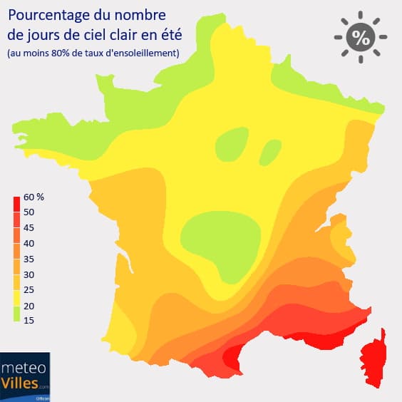 Pourcentage du nombre de jours de ciel clair entre juin et août - Météo Villes