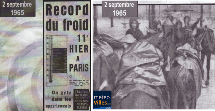 Le mois de septembre 1965 figure parmi les plus frais qu’ait connu la France. C’est durant la première semaine du mois que le déficit thermique est le plus important avec des températures dignes d’un mois de novembre. La rentrée des classes se déroule sous une météo épouvantable. Les températures plafonnent parfois entre 10 et 12°C du sud-ouest aux régions centrales et la pluie arrose de nombreuses régions. En montagne, la neige apparaît dès 1200 mètres !