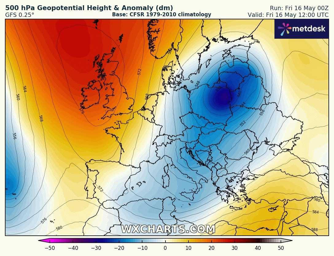 Animation des anomalies de géopotentiels à 500hPa sur l'Europe du 16 au 22 mai 2025 – Modèle GFS via WX CHARTS