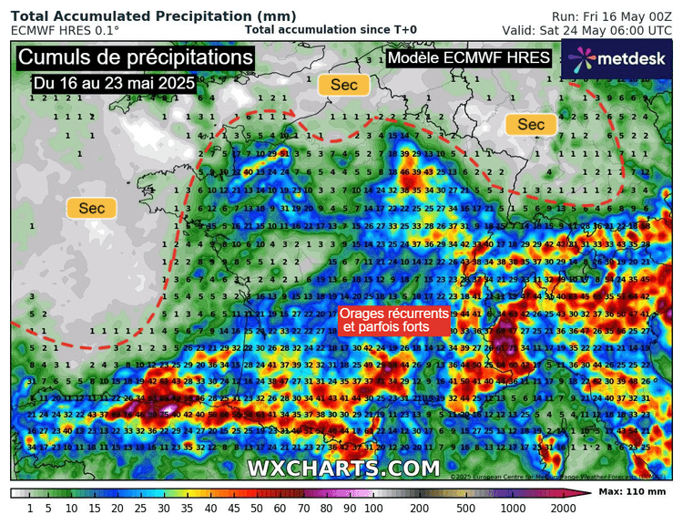 Cumuls de précipitations du 16 au 24 mai 2025 sur la France – Modèles GFS et ECMWF HRES via WX CHARTS
