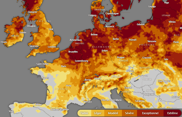 Ce brasier intervient dans un contexte de manque de pluie, après plusieurs semaines de domination anticyclonique sur de nombreux pays européens. Actuellement, les sols sont anormalement secs de l'ouest de la Russie aux Îles Britanniques et jusqu'au nord et à l'est de la France. Le Massif Central n'est pas épargné, même si le déficit d'humidité est moins prononcé que vers les frontières du nord ou la Belgique.