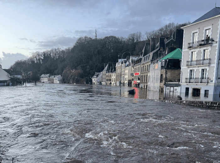 Un peu plus tôt, c'est la ville de Quimper qui fut parmi les premières à subir les crues. Le Steïr, affluent du fleuve Odet, a débordé dans une partie du centre-ville. Il faut dire que les cumuls de précipitations sont remarquables dans le secteur, qui a reçu une soixantaine de millimètres de pluie en 24 heures et qui dépasse la barre des 200 mm depuis le début du mois de janvier 2026 ! C'est la répétition de ces épisodes pluvieux qui cause la saturation des sols et le débordement des cours d'eau.