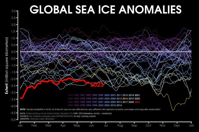 Enfin, la superficie globale des glaces de mers aux pôles atteignait également un record bas pour un 23 mai avec un étendue totale de glace de 21,47 millions de km, un chiffre qui n'avait jamais été aussi bas en cette période.