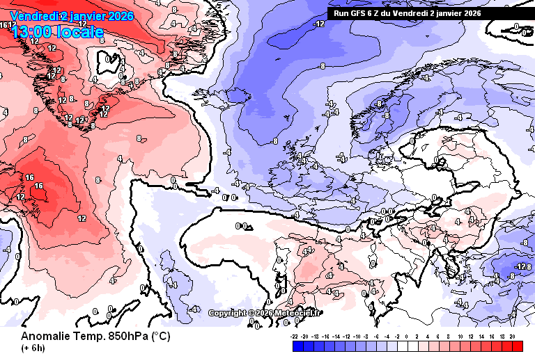 Anomalies de températures à 850 hPa sur l'Europe du 2 au 7 janvier 2026 – Modèle GFS via meteociel.fr