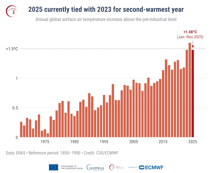 Sur la période allant de janvier à novembre 2025, l'anomalie thermique sur Terre atteint +1,48°C par rapport à l'ère pré-industrielle (1850-1900) ! Ce chiffre est très proche de l'objectif des accords de Paris sur le climat, adopté fin 2015, qui visaient à limiter le réchauffement à +1,5°C. Cette anomalie est semblable à celle enregistrée durant l'année 2023 mais reste derrière celle de 2024, qui était devenue la première année à dépasser la barre symbolique des +1,5°C avec une anomalie mondiale sur 12 mois de +1,55°C.