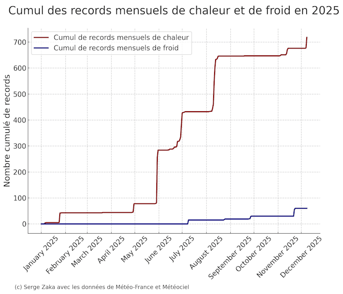 Si 2025 ne sera pas l'année la plus chaude mesurée en France, elle terminera quoiqu'il arrive dans le quatuor de tête. Elle a aussi été marquée par de très nombreux records de douceur et de chaleur, particulièrement entre la fin mai et le mois d'août, en lien avec de multiples vagues de chaleur et de canicule. À ce jour, on dénombre plus de 700 records mensuels de douceur/chaleur battus depuis le début de l'année, contre seulement 60 records de froid. Les records de chaleur sont 12 fois plus nombreux !