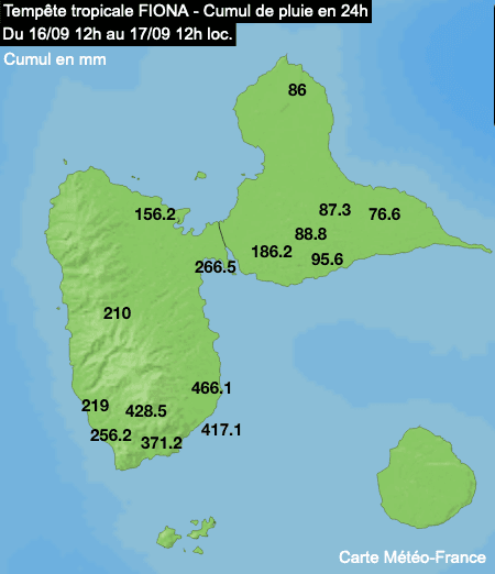 Des quantités particulièrement importantes se sont déversées sur la Guadeloupe au cours de la nuit du 16 au 17 septembre, avec des intensités horaires parfois incroyables dépassant les 100mm: