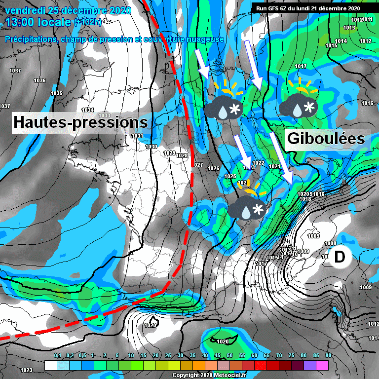 Schéma de la situation atmosphérique sur la France pour a journée du 25 décembre – modèle GFS via météociel.fr